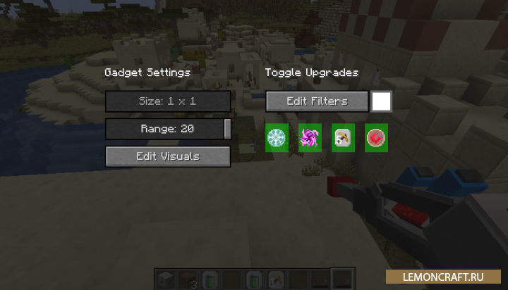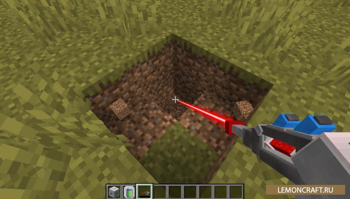 Мод на лазер Mining Gadgets добавит в игру новый инструмент, лазерный пистолет (или лазерное орудие, кому как удобнее), с помощь которого вы сможете добывать блоки. Убить из данного орудия у вас никого не получится. Благодаря модификаторам вы можете развивать данное орудие, повышая его уровень. Вы можете увеличить скорость работы, разрушаемую площадь, увеличить емкость батареи и др. Отличный инструмент, который заменит устаревшую, в наше время, кирку.