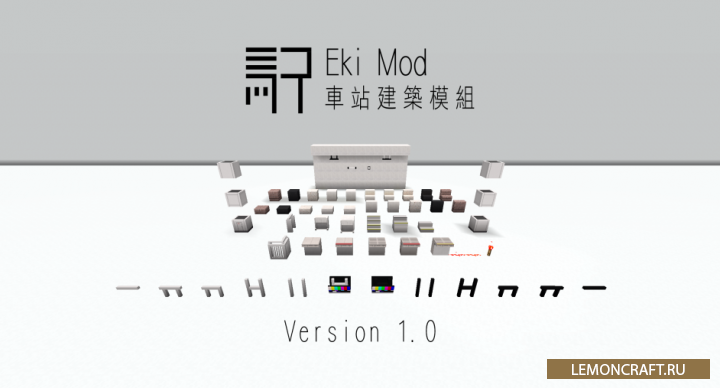 Мод на оформление ж/д станций Eki является декоративным модом, добавляющим в игру различные блоки предназначенные для оформления или постройки с нуля железнодорожных станций и железных дорог. Мод создан японским разработчиком, что сказывается на качестве прорисованных деталей.